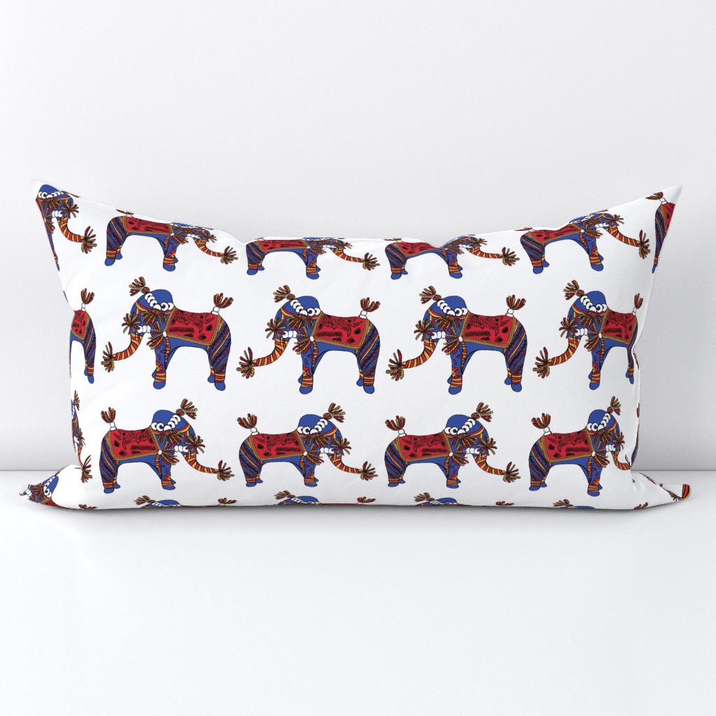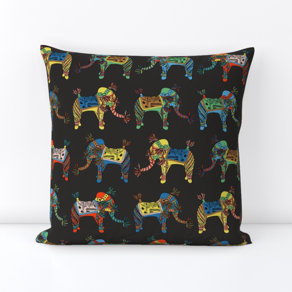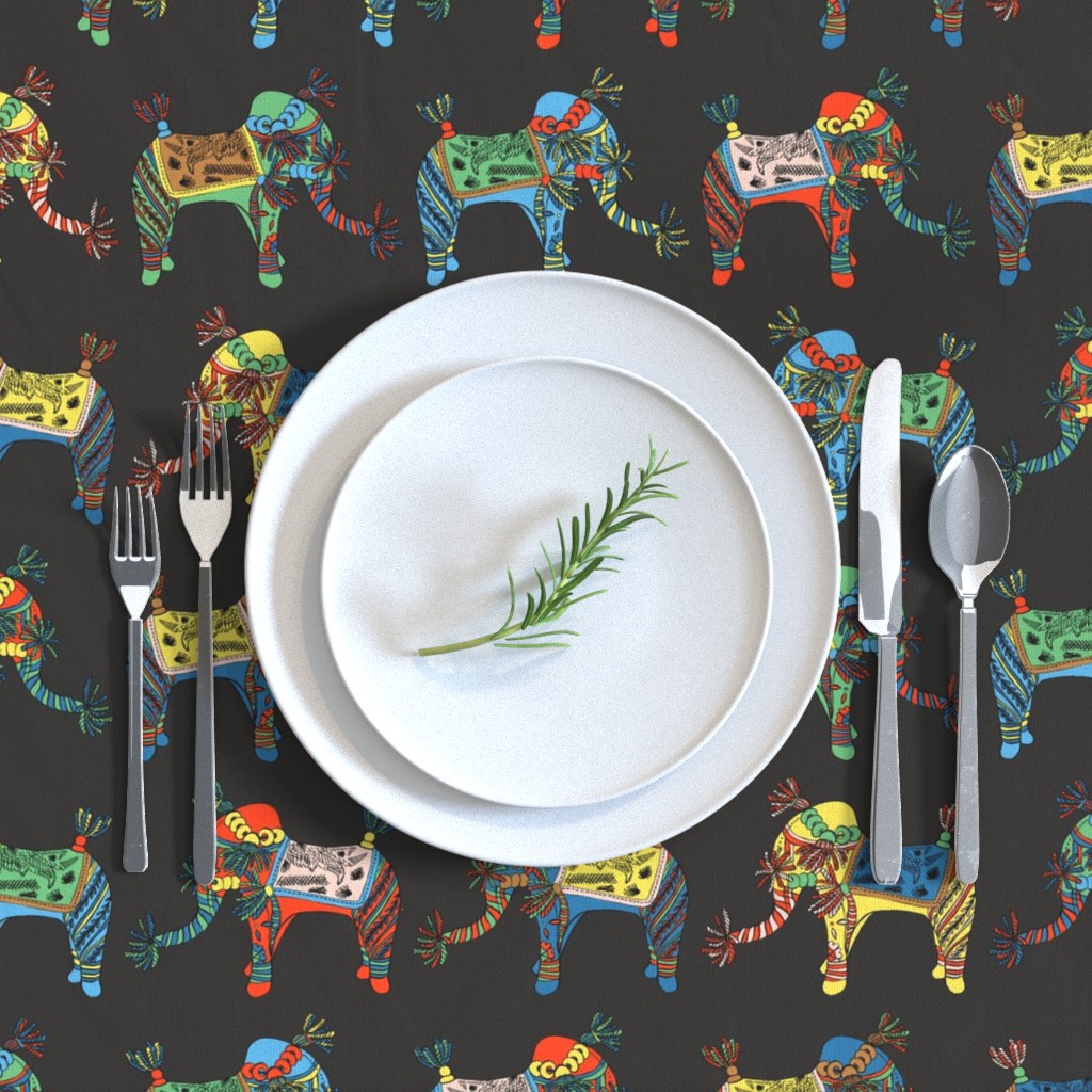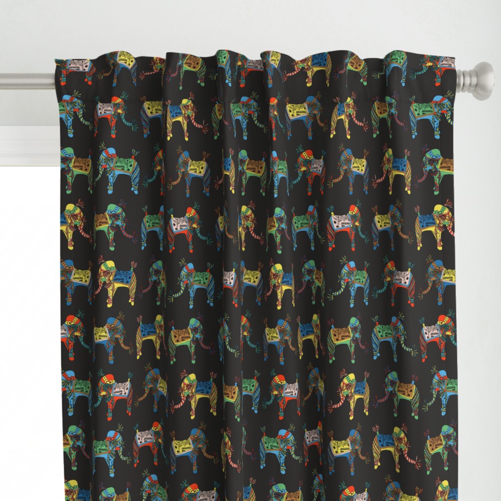 Elephants symbolise happiness, and this very joyful elephant motif is printed in multiple colours spread across a black or white background.